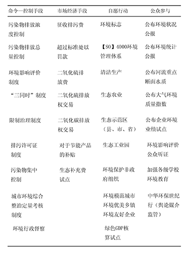 關于我國環(huán)境治理的實踐過程,張坤民等(2007) 建立了包栝命令—控制手段、經(jīng)濟刺激手段和公眾參與或稱自愿手段等多樣化的環(huán)境政策工具矩陣。見表2.1