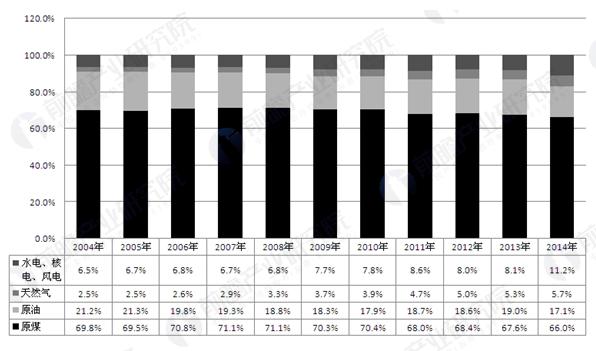 2004-2014年我國(guó)能源消費(fèi)結(jié)構(gòu)(單位:%)