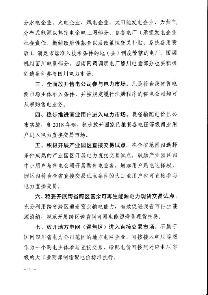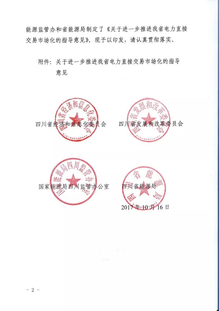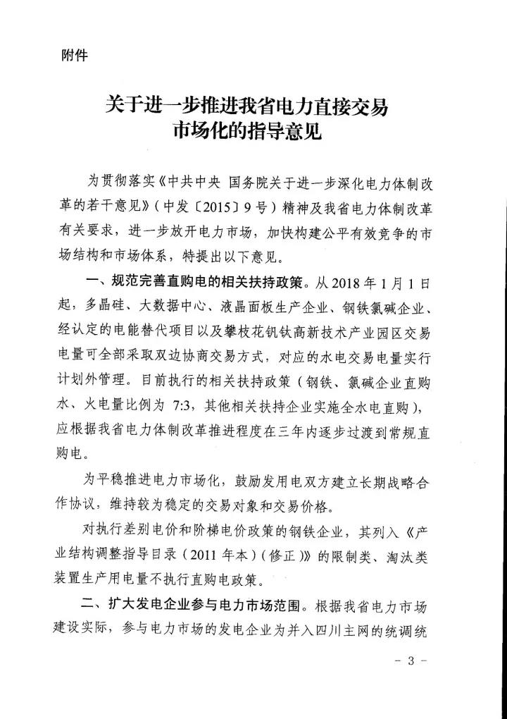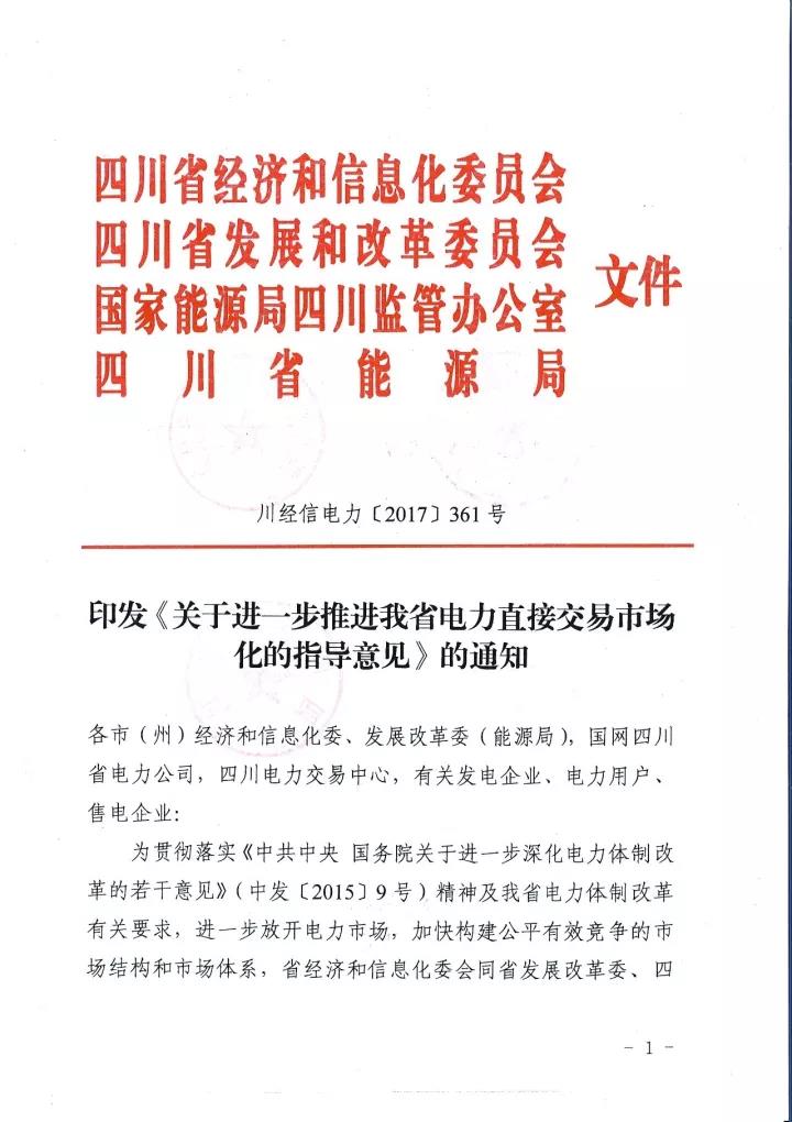 四川省經信委、四川省發(fā) 改委、國家能源局四川監(jiān)管辦、四川省能源局日前聯合下發(fā)了《關于進一步推進我省電力直接交易市場化的指導意見》(以下簡稱“意見”)。意見中稱,將規(guī)范完善直購電的相關扶持政策,擴大發(fā)電企業(yè)參與電力市場范圍,全面放開售電公司參與電力市場,穩(wěn)步推進進商業(yè)用戶進入電力市場,積極開展產業(yè)園區(qū)直接交易試點,穩(wěn)妥開展跨省跨區(qū)富余可再生能源電力現貨交易試點,放開地方電網(躉售區(qū))進入直接交易市場,有序推進其他特殊行業(yè)企業(yè)完全電力市場化。詳情如下: