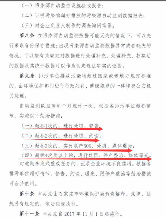 近日河北石家莊市環(huán)保局印發(fā)《石家莊市污染源自動監(jiān)測數(shù)據(jù)超標(biāo)懲治辦法(試行)》(以下簡稱“辦法”)。辦法明確,企業(yè)污染源自動監(jiān)測數(shù)據(jù)出現(xiàn)超標(biāo)將被處罰,超標(biāo)4次及以上,將停產(chǎn)整治。辦法自11月1日起施行。