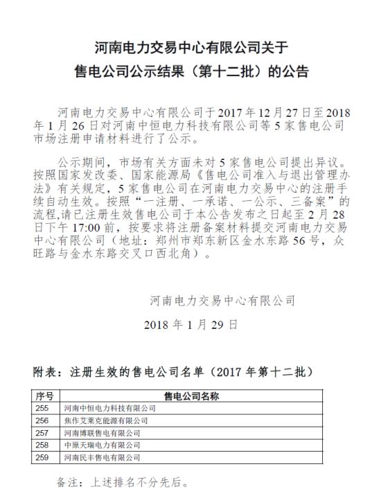 日前,河南電力交易中心發布了關于售電公司公示結果(第十二批)的公告,公告中稱,于2017年12月27日至2018年1月26日對河南中恒電力科技有限公司等5家售電公司注冊申請材料進行了公示,未收到異議,注冊手續自動生效。