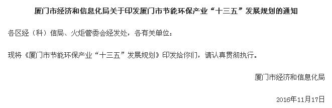 廈門市經濟和信息化局關于印發廈門市節能環保產業“十三五”發展規劃的通知: