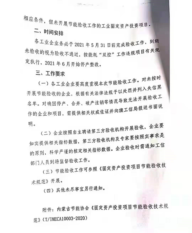 烏拉特前旗:對全旗工業(yè)企業(yè)開展節(jié)能審查驗收,對期限內(nèi)驗收不通過的企業(yè),按能耗“雙控”工作違規(guī)項目有關(guān)規(guī)定執(zhí)行停產(chǎn)整改。