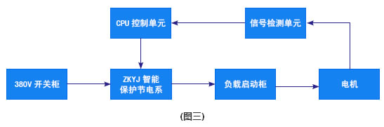 由圖三所示,在低壓380V開關(guān)柜與負(fù)載(風(fēng)機(jī)、水泵、空壓機(jī)、及電機(jī)拖動(dòng)類)啟動(dòng)柜之間串接智能保護(hù)節(jié)電系統(tǒng),系統(tǒng)在電機(jī)的使用上,它能自動(dòng)跟蹤檢測(cè)電機(jī)運(yùn)行中的負(fù)載變化,將檢測(cè)信號(hào)反饋給控制中心,經(jīng)過中央處理,運(yùn)算放大后給出指令信號(hào),以此來改變有功電量的輸出,使電機(jī)在最經(jīng)濟(jì)的電耗下運(yùn)行,達(dá)到節(jié)電的目的。